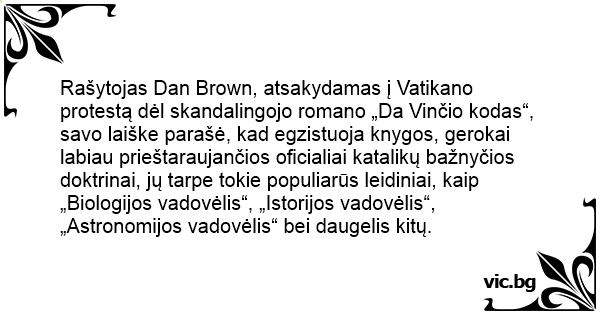 Rašytojas Dan Brown, atsakydamas į Vatikano protestą dėl skandalingojo romano „Da Vinčio kodas“, savo laiške parašė, kad egzistuoja knygos, gerokai labiau prieštaraujančios oficialiai katalikų bažnyčios doktrinai, jų tarpe tokie populiarūs leidiniai, kaip „Biologijos vadovėlis“, „Istorijos vadovėlis“, „Astronomijos vadovėlis“ bei daugelis kitų.