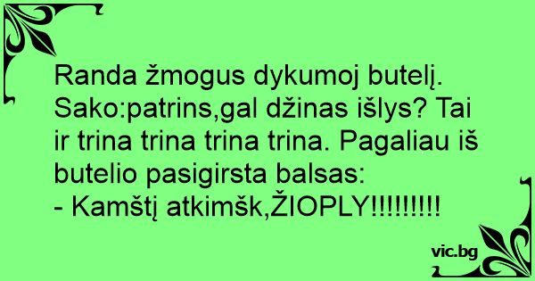 Randa žmogus dykumoj butelį. Sako:patrins,gal džinas išlys? Tai ir trina trina trina trina. Pagaliau iš butelio pasigirsta balsas: