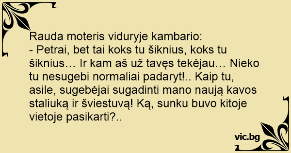 - Petrai, bet tai koks tu šiknius, koks tu šiknius… Ir kam aš už tavęs tekėjau… Nieko tu nesugebi normaliai padaryt!.. Kaip tu, asile, sugebėjai sugadinti mano naują kavos staliuką ir šviestuvą! Ką, sunku buvo kitoje vietoje pasikarti?..