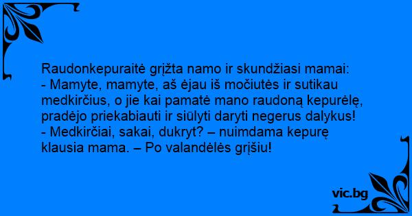 - Mamyte, mamyte, aš ėjau iš močiutės ir sutikau medkirčius, o jie kai pamatė mano raudoną kepurėlę, pradėjo priekabiauti ir siūlyti daryti negerus dalykus!