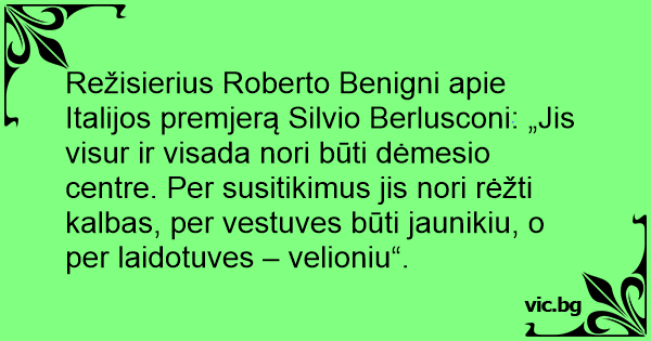Režisierius Roberto Benigni apie Italijos premjerą Silvio Berlusconi: „Jis visur ir visada nori būti dėmesio centre. Per susitikimus jis nori rėžti kalbas, per vestuves būti jaunikiu, o per laidotuves – velioniu“.