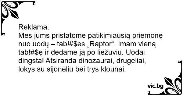 Mes jums pristatome patikimiausią priemonę nuo uodų – tab!#$es „Raptor“. Imam vieną tab!#$ę ir dedame ją po liežuviu. Uodai dingsta! Atsiranda dinozaurai, drugeliai, lokys su sijonėliu bei trys klounai.