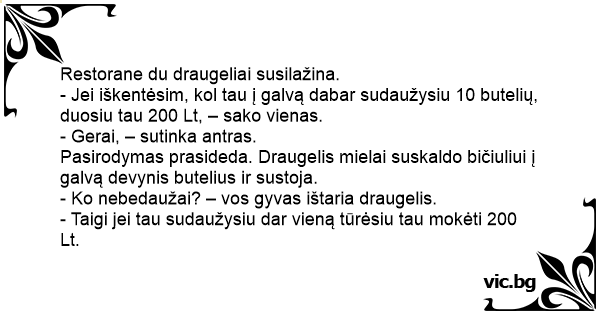 - Jei iškentėsim, kol tau į galvą dabar sudaužysiu 10 butelių, duosiu tau 200 Lt, – sako vienas.
