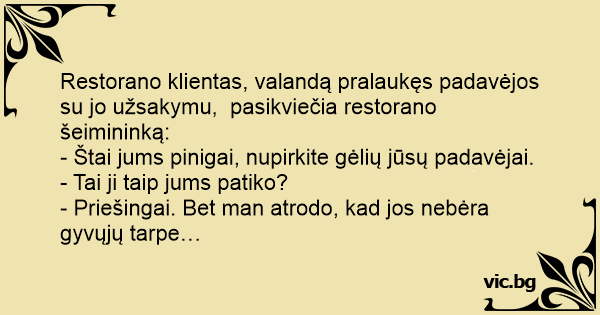 Restorano klientas, valandą pralaukęs padavėjos su jo užsakymu, pasikviečia restorano šeimininką: