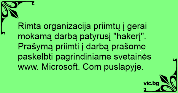 Rimta organizacija priimtų į gerai mokamą darbą patyrusį "hakerį". Prašymą priimti į darbą prašome paskelbti pagrindiniame svetainės www. Microsoft. Com puslapyje.