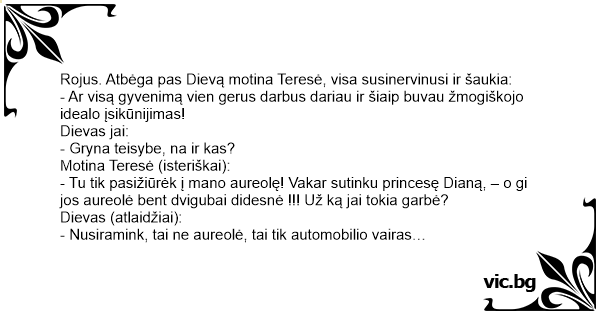 - Tu tik pasižiūrėk į mano aureolę! Vakar sutinku princesę Dianą, – o gi jos aureolė веnт dvigubai didesnė !!! Už ką jai tokia garbė?