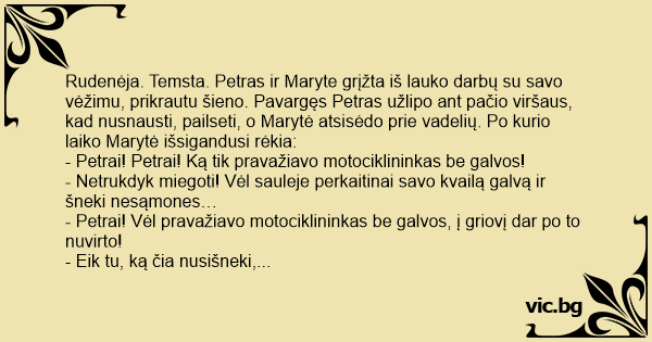 - Petrai! Vėl pravažiavo motociklininkas be galvos, į griovį dar po to nuvirto!