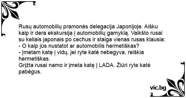 Rusų automobilių pramonės delegacija Japonijoje. Aišku kaip ir dera ekskursija į automobilių gamyklą. Vaikšto rusai su keliais japonais po cechus ir staiga vienas rusas klausia: