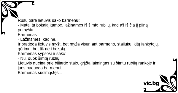 Lietuvis nueina prie biliardo stalo, grįžta laimingas su šimtu rublių rankoje ir juos paduoda barmenui.