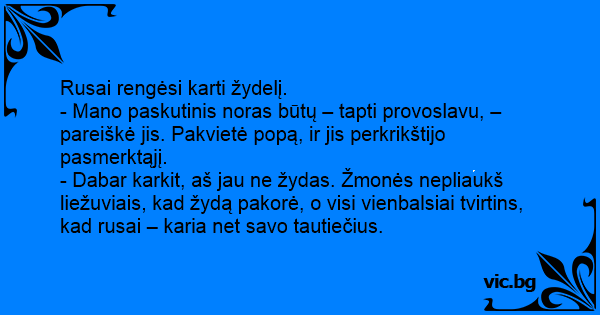 - Dabar karkit, aš jau ne žydas. Žmonės nepliaukš liežuviais, kad žydą pakorė, o visi vienbalsiai tvirtins, kad rusai – karia net savo tautiečius.