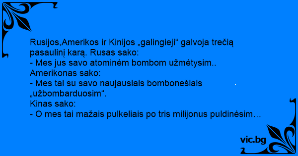 Rusijos,Amerikos ir Kinijos „galingieji“ galvoja trečią pasaulinį karą. Rusas sako: