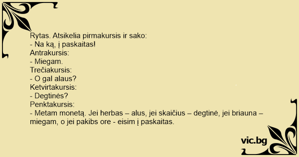 - Metam monetą. Jei herbas – alus, jei skaičius – degtinė, jei briauna – miegam, o jei pakibs ore - eisim į paskaitas.