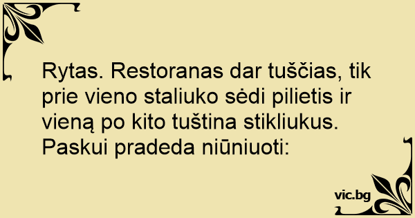 Rytas. Restoranas dar tuščias, tik prie vieno staliuko sėdi pilietis ir vieną po kito tuština stikliukus. Paskui pradeda niūniuoti: