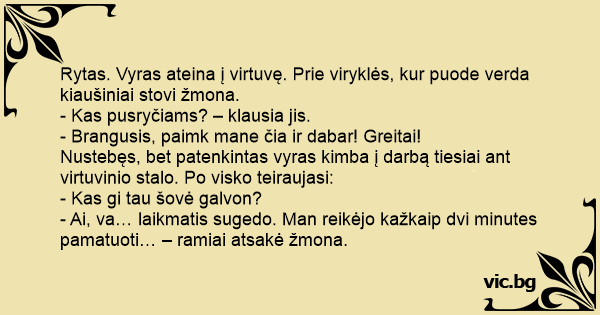 Nustebęs, bet patenkintas vyras kimba į darbą tiesiai ant virtuvinio stalo. Po visko teiraujasi: