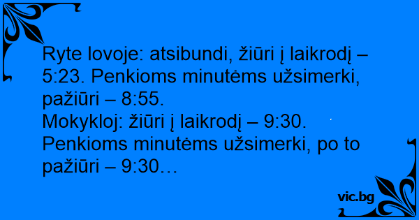 Ryte lovoje: atsibundi, žiūri į laikrodį – 5:23. Penkioms minutėms užsimerki, pažiūri – 8:55.