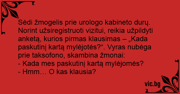 Sėdi žmogelis prie urologo kabineto durų. Norint užsiregistruoti vizitui, reikia užpildyti anketą, kurios pirmas klausimas – „Kada paskutinį kartą mylėjotės?“. Vyras nubėga prie taksofono, skambina žmonai: