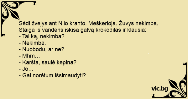 Sėdi žvejys ant Nilo kranto. Meškerioja. Žuvys nekimba. Staiga iš vandens iškiša galvą krokodilas ir klausia: