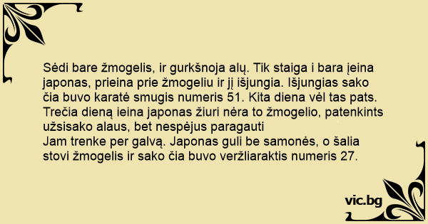 Sėdi bare žmogelis, ir gurkšnoja alų. Tik staiga i bara įeina japonas, prieina prie žmogeliu ir jį išjungia. Išjungias sako čia buvo karatė smugis numeris 51. Kita diena vėl tas pats. Trečia dieną ieina japonas žiuri nėra to žmogelio, patenkints užsisako alaus, bet nespėjus paragauti