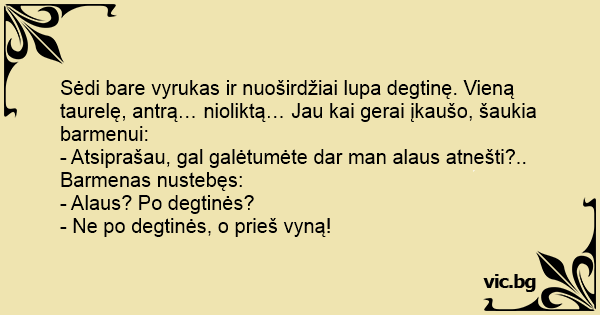 Sėdi bare vyrukas ir nuoširdžiai lupa degtinę. Vieną taurelę, antrą… nioliktą… Jau kai gerai įkaušo, šaukia barmenui: