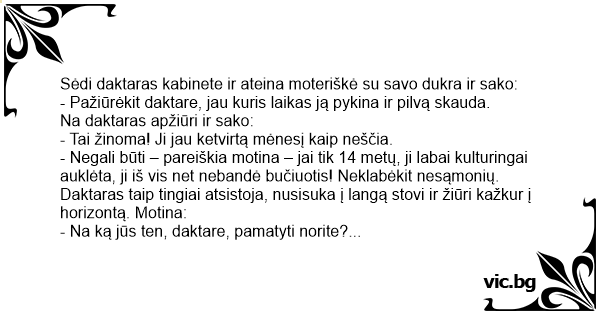 Sėdi daktaras kabinete ir ateina moteriškė su savo dukra ir sako: - Pažiūrėkit daktare, jau kuris laikas ją pykina ir pilvą skauda. Na daktaras apžiūri ir sako: - Tai žinoma! Ji jau ketvirtą mėnesį kaip neščia. - Negali būti – pareiškia motina – jai tik 14 metų, ji labai kulturingai auklėta, ji iš vis net nebandė bučiuotis! Neklabėkit nesąmonių. Daktaras taip tingiai atsistoja, nusisuka į langą stovi ir žiūri kažkur į horizontą. Motina: - Na ką jūs ten, daktare, pamatyti norite? Daktaras: - Na matot, paprastai tokiais atvejais Šiaurinė žvaigždė pradeda labai ryškiai šviesti ir į žemę nusileidžia trys žiniai. Tai va, stoviu laukiu…