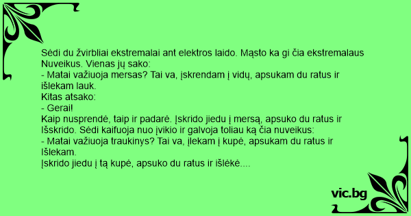 Sėdi du žvirbliai ekstremalai ant elektros laido. Mąsto ka gi čia ekstremalaus
