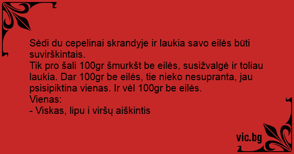 Tik pro šali 100gr šmurkšt be eilės, susižvalgė ir toliau laukia. Dar 100gr be eilės, tie nieko nesupranta, jau psisipiktina vienas. Ir vėl 100gr be eilės.