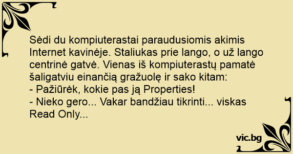 Sėdi du kompiuterastai paraudusiomis akimis Internet kavinėje. Staliukas prie lango, o už lango centrinė gatvė. Vienas iš kompiuterastų pamatė šaligatviu einančią gražuolę ir sako kitam: