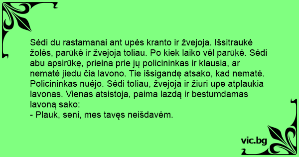 Sėdi du rastamanai ant upės kranto ir žvejoja. Išsitraukė žolės, parūkė ir žvejoja toliau. Po kiek laiko vėl parūkė. Sėdi abu apsirūkę, prieina prie jų policininkas ir klausia, ar nematė jiedu čia lavono. Tie išsigandę atsako, kad nematė. Policininkas nuėjo. Sėdi toliau, žvejoja ir žiūri upe atplaukia lavonas. Vienas atsistoja, paima lazdą ir bestumdamas lavoną sako:
