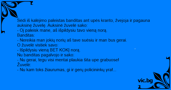 Sėdi iš kalėjimo paleistas banditas ant upės kranto, žvejoja ir pagauna auksinę žuvelę. Auksinė žuvelė sako: