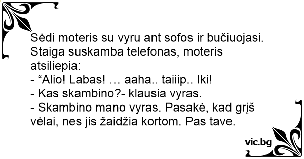 - Skambino mano vyras. Pasakė, kad grįš vėlai, nes jis žaidžia kortom. Pas tave.