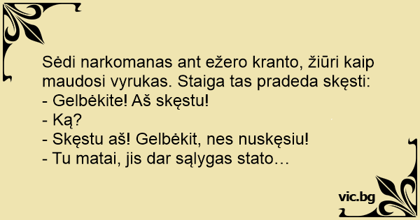 Sėdi narkomanas ant ežero kranto, žiūri kaip maudosi vyrukas. Staiga tas pradeda skęsti: