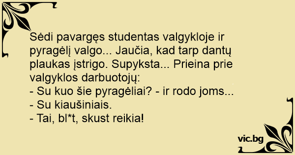 Sėdi pavargęs studentas valgykloje ir pyragėlį valgo... Jaučia, kad tarp dantų plaukas įstrigo. Supyksta... Prieina prie valgyklos darbuotojų:
