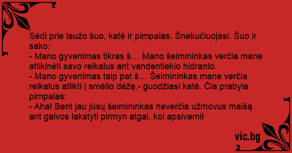 - Mano gyvenimas taip pat š… Šeimininkas mane verčia reikalus atlikti į smėlio dėžę,- guodžiasi katė. Čia prabyla pimpalas: