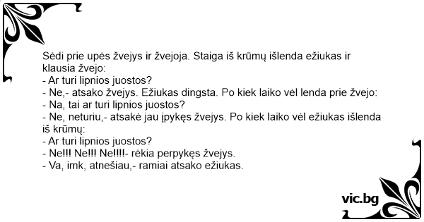 - Ne, neturiu,- atsakė jau įpykęs žvejys. Po kiek laiko vėl ežiukas išlenda iš krūmų: