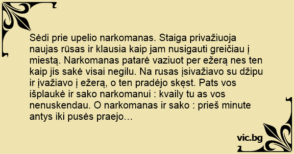 Sėdi prie upelio narkomanas. Staiga privažiuoja naujas rūsas ir klausia kaip jam nusigauti greičiau į miestą. Narkomanas patarė vaziuot per ežerą nes ten kaip jis sakė visai negilu. Na rusas įsivažiavo su džipu ir įvažiavo į ežerą, o ten pradėjo skęst. Pats vos išplaukė ir sako narkomanui : kvaily tu as vos nenuskendau. O narkomanas ir sako : prieš minute antys iki pusės praejo…