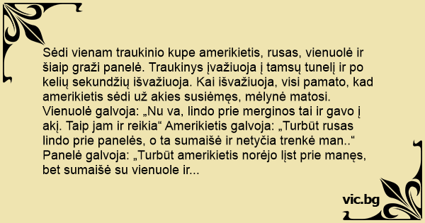 Sėdi vienam traukinio kupe amerikietis, rusas, vienuolė ir šiaip graži panelė. Traukinys įvažiuoja į tamsų tunelį ir po kelių sekundžių išvažiuoja. Kai išvažiuoja, visi pamato, kad amerikietis sėdi už akies susiėmęs, mėlynė matosi. Vienuolė galvoja: „Nu va, lindo prie merginos tai ir gavo į akį. Taip jam ir reikia“ Amerikietis galvoja: „Turbūt rusas lindo prie panelės, o ta sumaišė ir netyčia trenkė man..“ Panelė galvoja: „Turbūt amerikietis norėjo lįst prie manęs, bet sumaišė su vienuole ir gavo į akį.. “ Rusas galvoja: „Kitam tunely ir vėl duosiu amerikiečiui į galvą.“