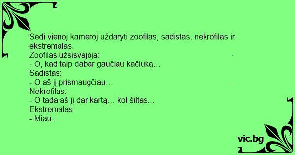 Sėdi vienoj kameroj uždaryti zoofilas, sadistas, nekrofilas ir ekstremalas.