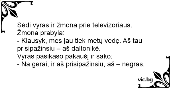 Sėdi vyras ir žmona prie televizoriaus. Žmona prabyla:
