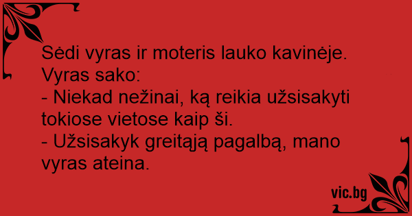 Sėdi vyras ir moteris lauko kavinėje. Vyras sako: