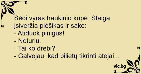 Sėdi vyras traukinio kupė. Staiga įsiveržia plėšikas ir sako: