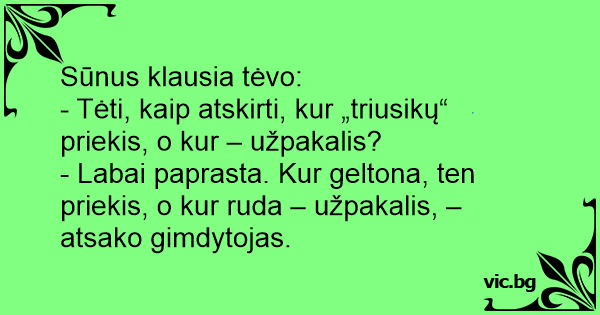 - Labai paprasta. Kur geltona, ten priekis, o kur ruda – užpakalis, – atsako gimdytojas.