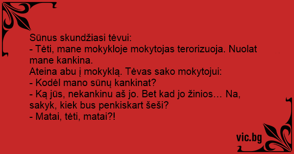 - Tėti, mane mokykloje mokytojas terorizuoja. Nuolat mane kankina.