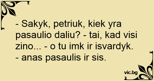 - Sakyk, petriuk, kiek yra pasaulio daliu? - tai, kad visi zino... - o tu imk ir isvardyk. - anas pasaulis ir sis.