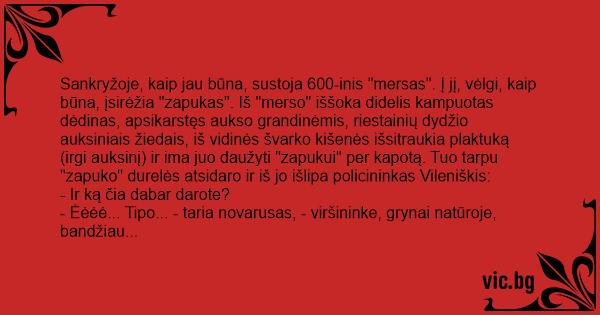 Sankryžoje, kaip jau būna, sustoja 600-inis "mersas". Į jį, vėlgi, kaip būna, įsirėžia "zapukas". Iš "merso" iššoka didelis kampuotas dėdinas, apsikarstęs aukso grandinėmis, riestainių dydžio auksiniais žiedais, iš vidinės švarko kišenės išsitraukia plaktuką (irgi auksinį) ir ima juo daužyti "zapukui" per kapotą. Tuo tarpu "zapuko" durelės atsidaro ir iš jo išlipa policininkas Vileniškis: