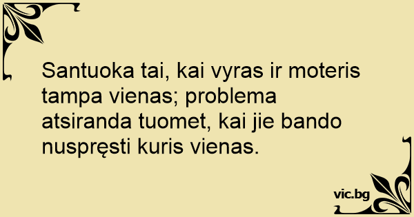 Santuoka tai, kai vyras ir moteris tampa vienas; problema atsiranda tuomet, kai jie bando nuspręsti kuris vienas.