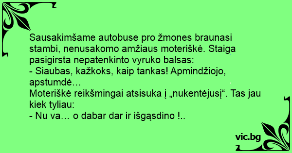 Sausakimšame autobuse pro žmones braunasi stambi, nenusakomo amžiaus moteriškė. Staiga pasigirsta nepatenkinto vyruko balsas: