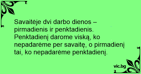 Savaitėje dvi darbo dienos – pirmadienis ir penktadienis. Penktadienį darome viską, ko nepadarėme per savaitę, o pirmadienį tai, ko nepadarėme penktadienį.