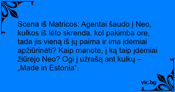 Scena iš Matricos: Agentai šaudo į Neo, kulkos iš lėto skrenda, kol pakimba ore, tada jis vieną iš jų paima ir ima įdėmiai apžiūrinėti? Kaip manote, į ką taip įdėmiai žiūrėjo Neo? Ogi į užrašą ant kulkų – „Made in Estonia“.