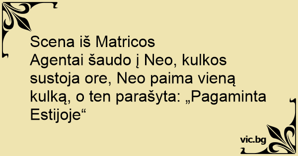 Agentai šaudo į Neo, kulkos sustoja ore, Neo paima vieną kulką, o ten parašyta: „Pagaminta Estijoje“
