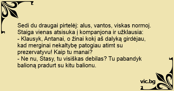 - Klausyk, Antanai, o žinai kokį aš dalyką girdėjau, kad merginai nekaltybę patogiau atimt su prezervatyvu! Kaip tu manai?